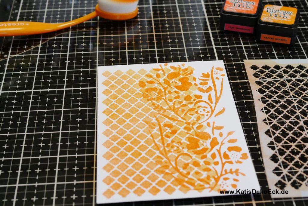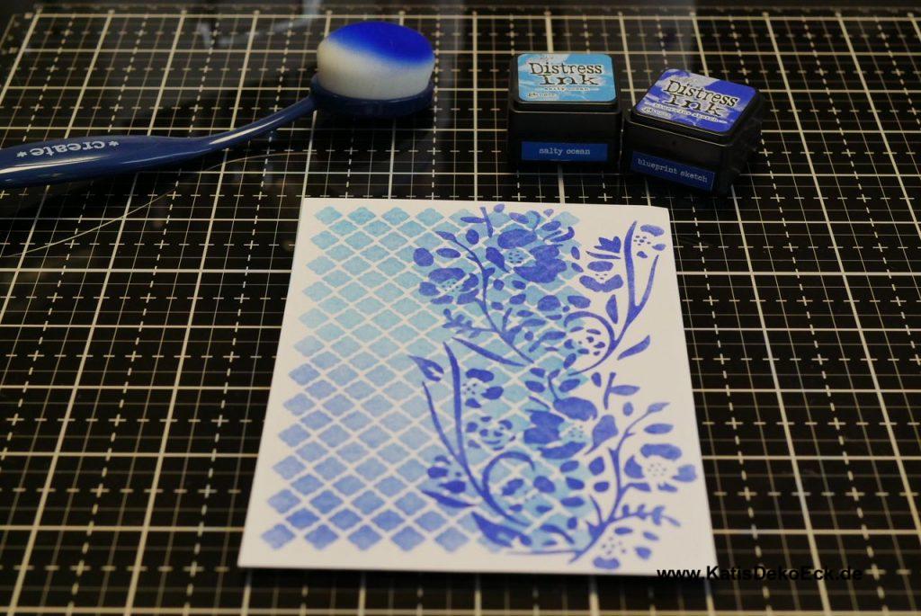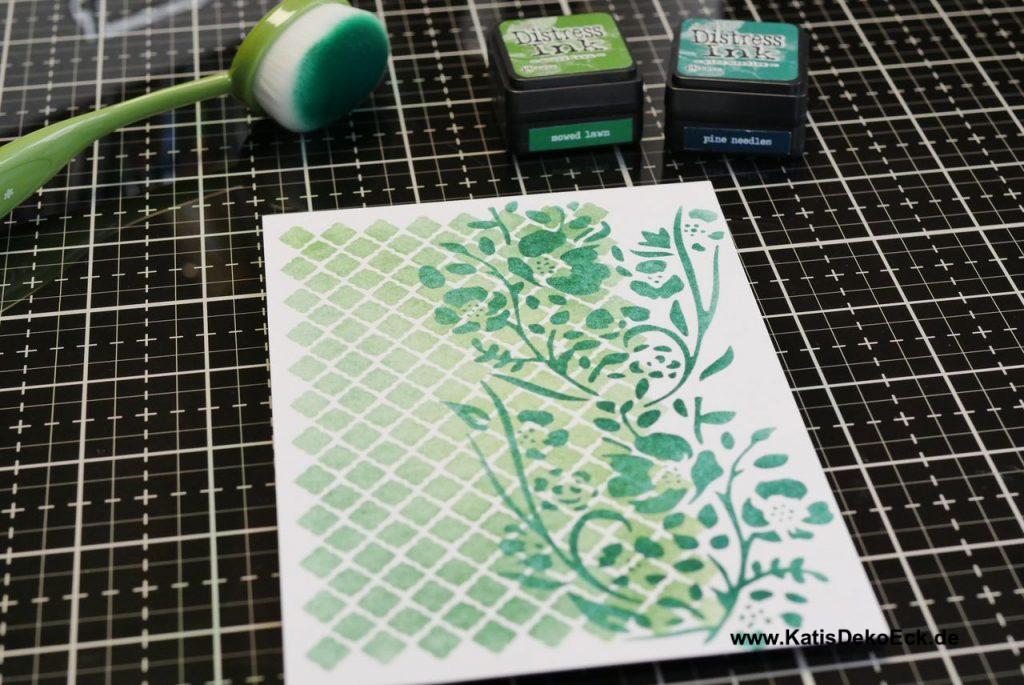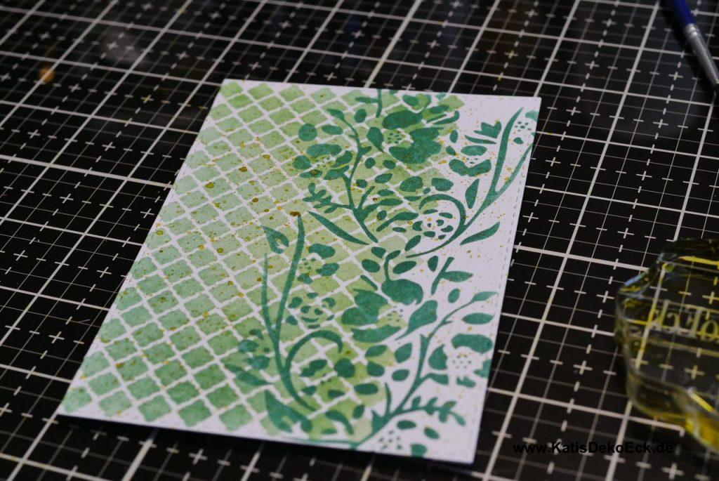 As a basis for the background of my card I decided to go with a stencil today. I chose one from Crafter’s Companion*, of course you can use, whatever you’ve got and like. I like this one especially, because you get a background and a floral element in one. But I will show you later, what exactly I mean: