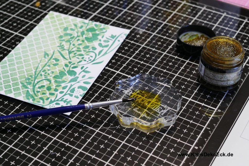 Sure, is missing. Definitely, and thus I reach for something not planned in advance: some liquid Spectrum Noir Sparkle Ink in golden. With a brush, an acrylic block and a drop of water it is very easy to splatter it across your backgrounds and then it sparkles and glitters… And again, as I am splattering the ink over all backgrounds at the same time, I only need to cleanup once afterwards.