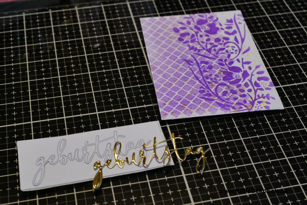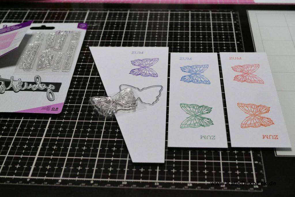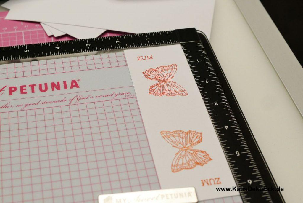 Right, just a “birthday” doesnt say enough, it needs the German equivalent to “Happy”. Which is “Zum” / ” On your” . And luckily exactly this is one of the stamps belonging to the die. But I want more. This card with the flowery motif, for me it also needs a butterfly.